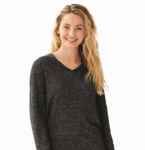 J-America Ladies Cozy Pullover Hood. 5.75oz 68% Polyester 24% Rayon 4% Spandex. Heathered Brushed Jersey. V-cut neckline. Self fabric cuffs with thumbholes. Rounded hemline.